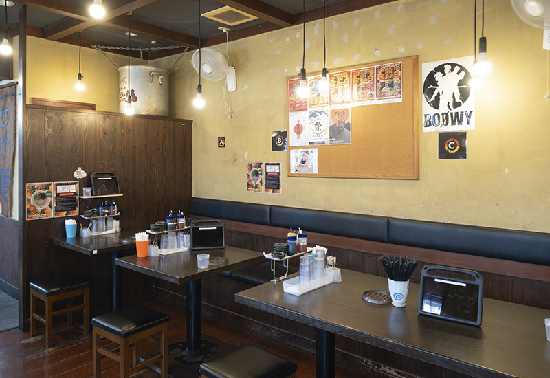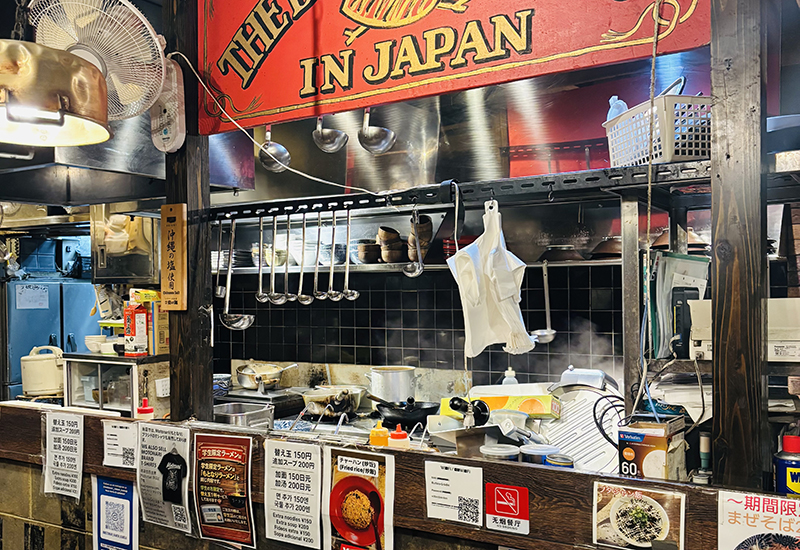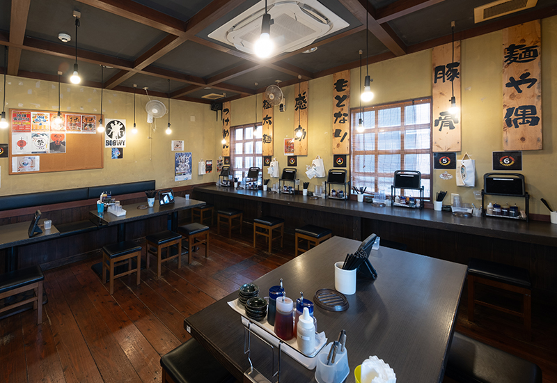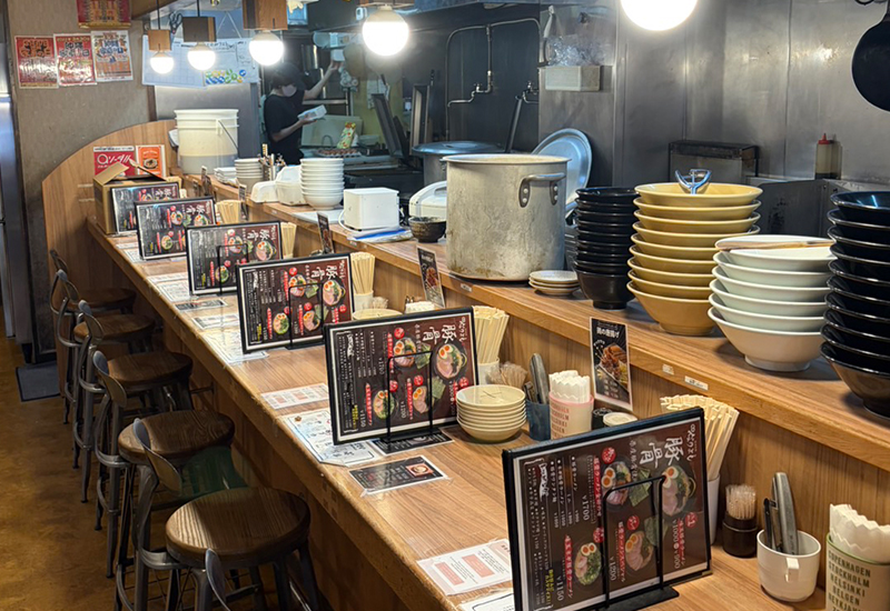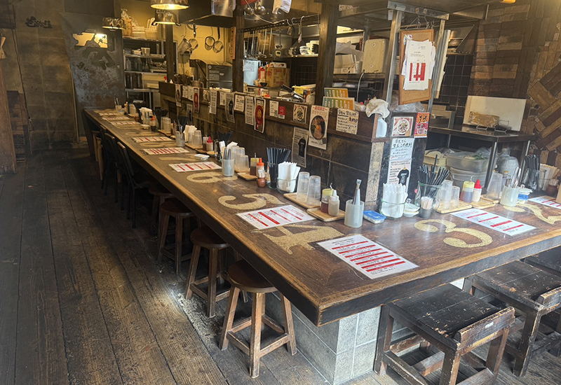 濃い木目を基調とした落ち着いた空間、券売機での注文スタイル、活気あるキッチンの様子など、